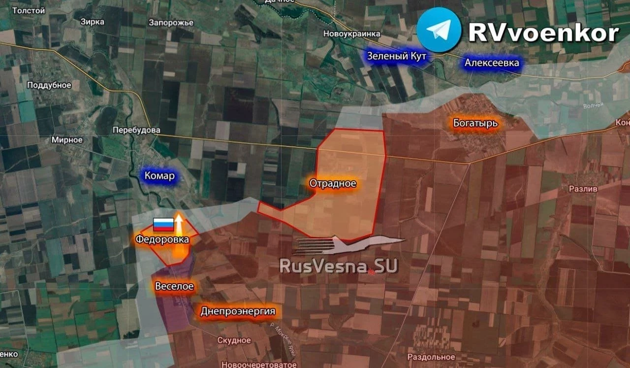 На Южно-Донецком направлении армия России практически зачистила Федоровку. Наступая к Комару бойцы группировки "Восток" ворвались в населенный пункт Федоровка и завершают зачистку последней окраины. Силы ВСУ в поселке уничтожены или бежали, сообщает Telegram-канал "Военкоры Русской Весны".