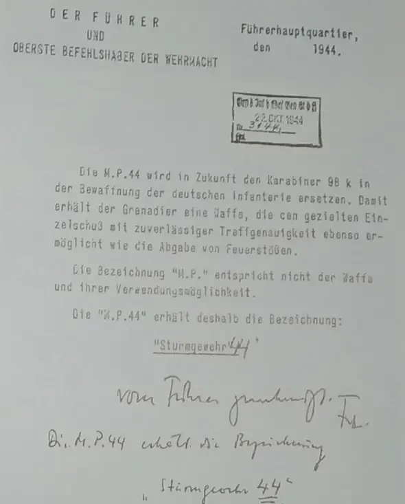 6 апреля 1944 года верховный главнокомандующий ВС Рейха издал приказ, посвященный системе стрелкового оружия вермахта, в котором MP 43 переименовали в MP 44, при том, что никаких нововведений не было. Осложнение военной ситуации привело к тому, что в октябре 1944 года Гитлеру пришлось издать еще один приказ, согласно которому MP 44 теперь назывался наконец-таки StG 44 (Sturmgewehr). Новое (правильное) название стало более точно отражать роль и основное назначение этого оружия в бою, хотя изначально оно было введено для поднятия духа войск. В конструкцию автомата не было внесено никаких изменений, за исключением штампа.