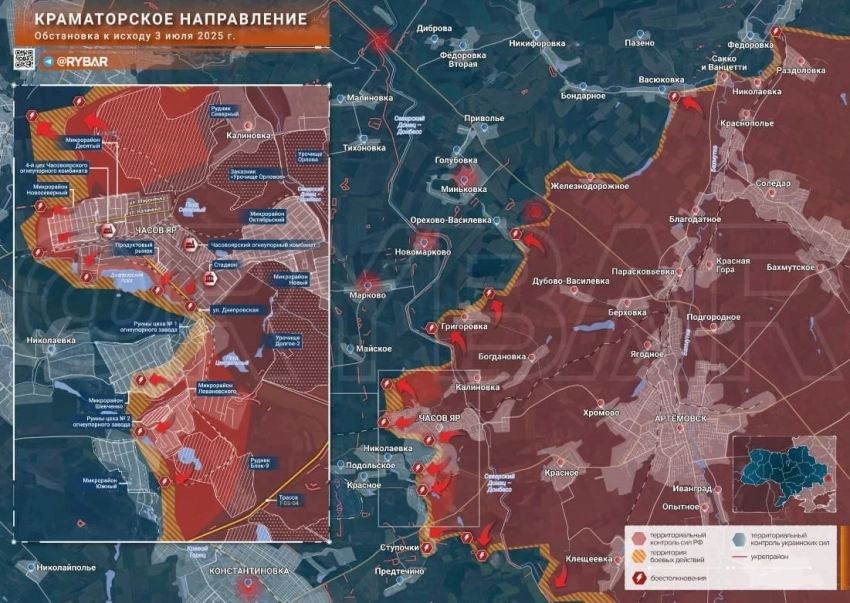 В Часов Яре продолжается тяжелейшее сражение за город. Враг имеет преимущество в дронах и наносит удары по всей территории города. На земле ВС РФ продвигаются и зачищают мкр. Шевченко. Наши штурмовики вышли к северным окраинам Николаевки и наносят удары, в том числе, по позициям врага в Червоном. В районе Ступочек тяжелые встречные бои, отмечает Олег Царёв в своём Telegram-канале.