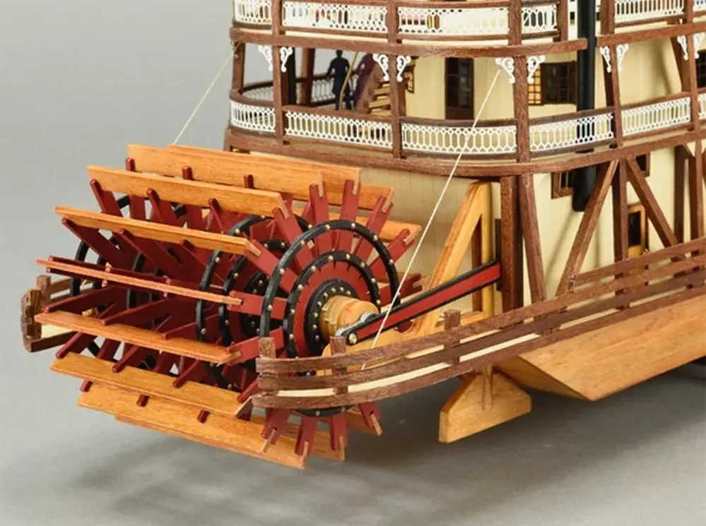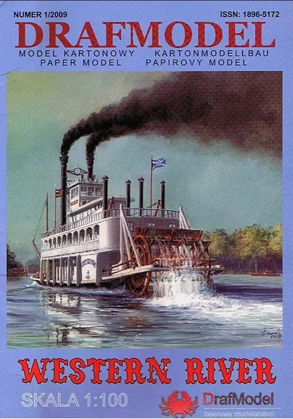 Интересным образом подошли к теме моделирования миссисипских пароходов в отечественной компании «Семейная фотостудия» из Санкт-Петербурга. Они взяли за основу бумажную модель фирмы «ДрафМодел» из их журнала № 1 за 2009 г. и весь силовой набор корпуса и палуб изготовили из тонкого, но прочного картона, методом лазерной резки. То есть эти детали просто выдавливаются из картонных листов, а затем уже на них наклеиваются цветные элементы из бумаги. Хотя, разумеется, большая часть деталей парохода так бумажными (в силу их масштабной толщины!) и осталась. Журнал с цветными развертками плюс лазерная резка стоят 1600 р., что вполне соответствует ожидаемому качеству. Кстати, и бумага, на которой напечатаны детали модели, значительно лучше той, что использовалась поляками в «Малом моделяже» в прежнее время. Масштаб модели 1:100.