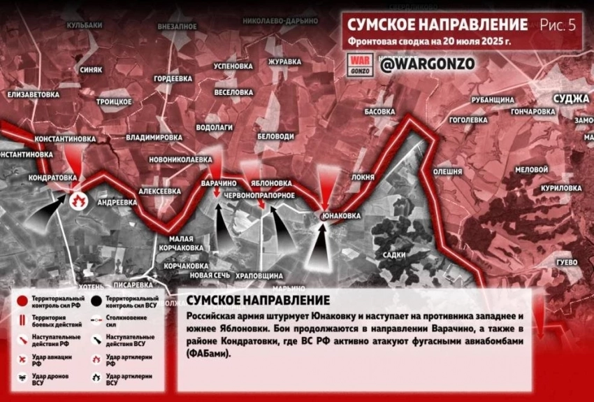 На Сумском направлении российская армия штурмует Юнаковку и наступает на противника западнее и южнее Яблоновки. Бои продолжаются в направлении Варачино, а также в районе Кондратовки, где, по сообщениям источников, ВС РФ активно атакуют фугасными авиабомбами (ФАБами).
