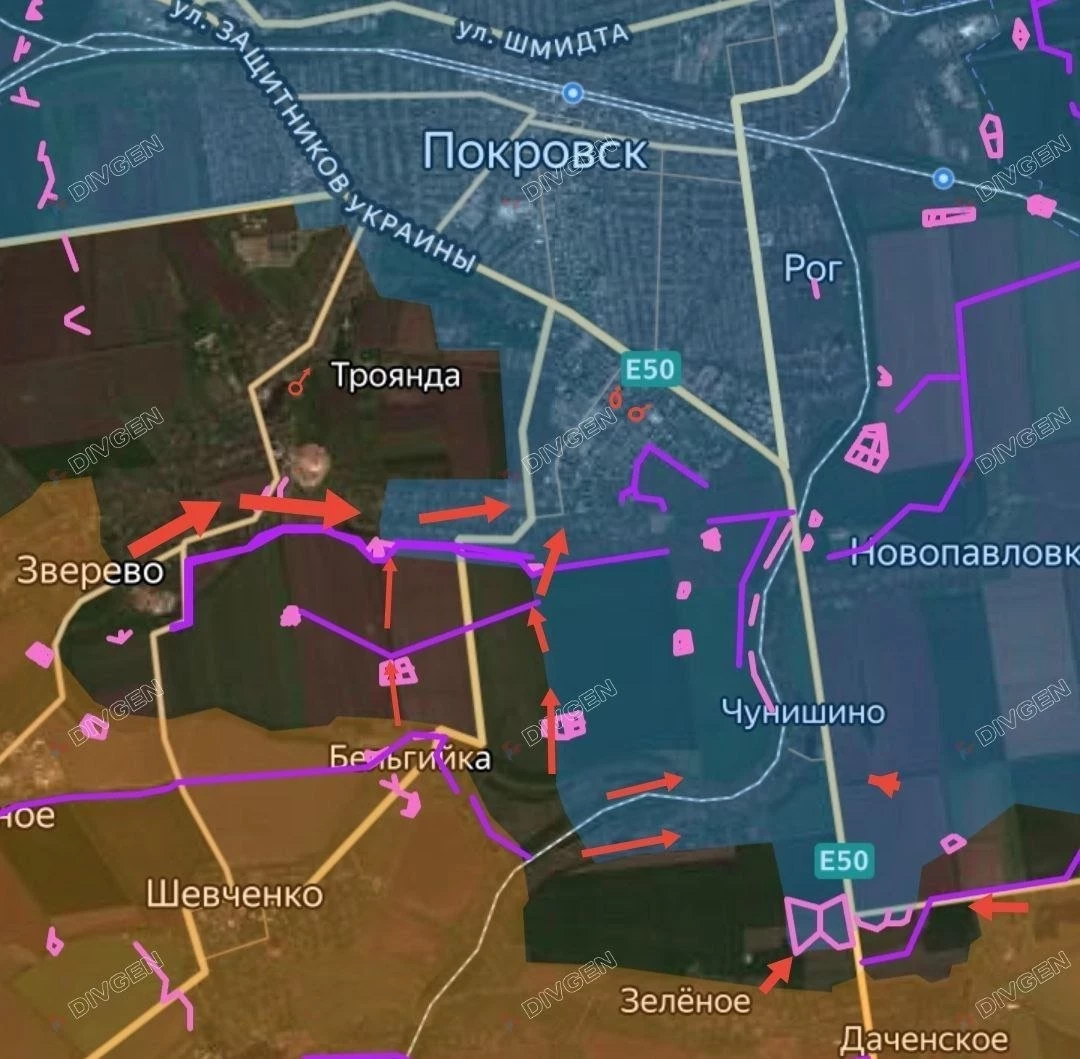 На Покровском направлении наши войска продвигаются между Орехово и Алексеевкой, постепенно закрывая карман и выравнивая фронт вдоль границы с Днепропетровской обл. Также армия России старается закрепиться в Зверево, с мест сообщают, что село в серой зоне. По ряду данных ВСУ выводят оттуда свои силы. Ожесточённые бои идут в Котлино - ВС РФ стараются выйти на западные подходы к Покровску. С мест сообщают о продвижении наших возле Леонтовичей, Удачного и Шевченко. На других участках фронта без существенных изменений.