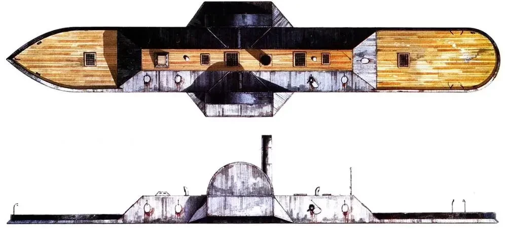 Таким, в частности, был броненосец северян «Чокто», названный так в честь одноименного индейского племени. На воду этот пароход, который изначально броненосцем, естественно, не был, спустили еще в 1856 году. Это было типичное двухколесное грузо-пассажирское судно, которое до 1862 года совершало торговые рейсы по реке Миссисипи. Во время гражданской войны оно было куплено армией Соединенных Штатов и переоборудовано в броненосец. На него установили железный подводный таран, а всю надводную часть защитили плоскими бронелистами и обложили «броней» из железнодорожных рельсов, заходивших друг за друга и таким образом создававших сплошную наклонную металлическую поверхность.