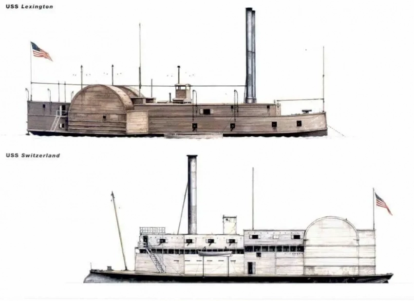Пароходы «Лексингтон» и «Свизеленд». Те же две трубы, только уже безо всяких украшений, те же два гребных колеса, две палубы. Но только всё это обшито толстыми деревянными брусьями с прорезанными в них амбразурами для пушек