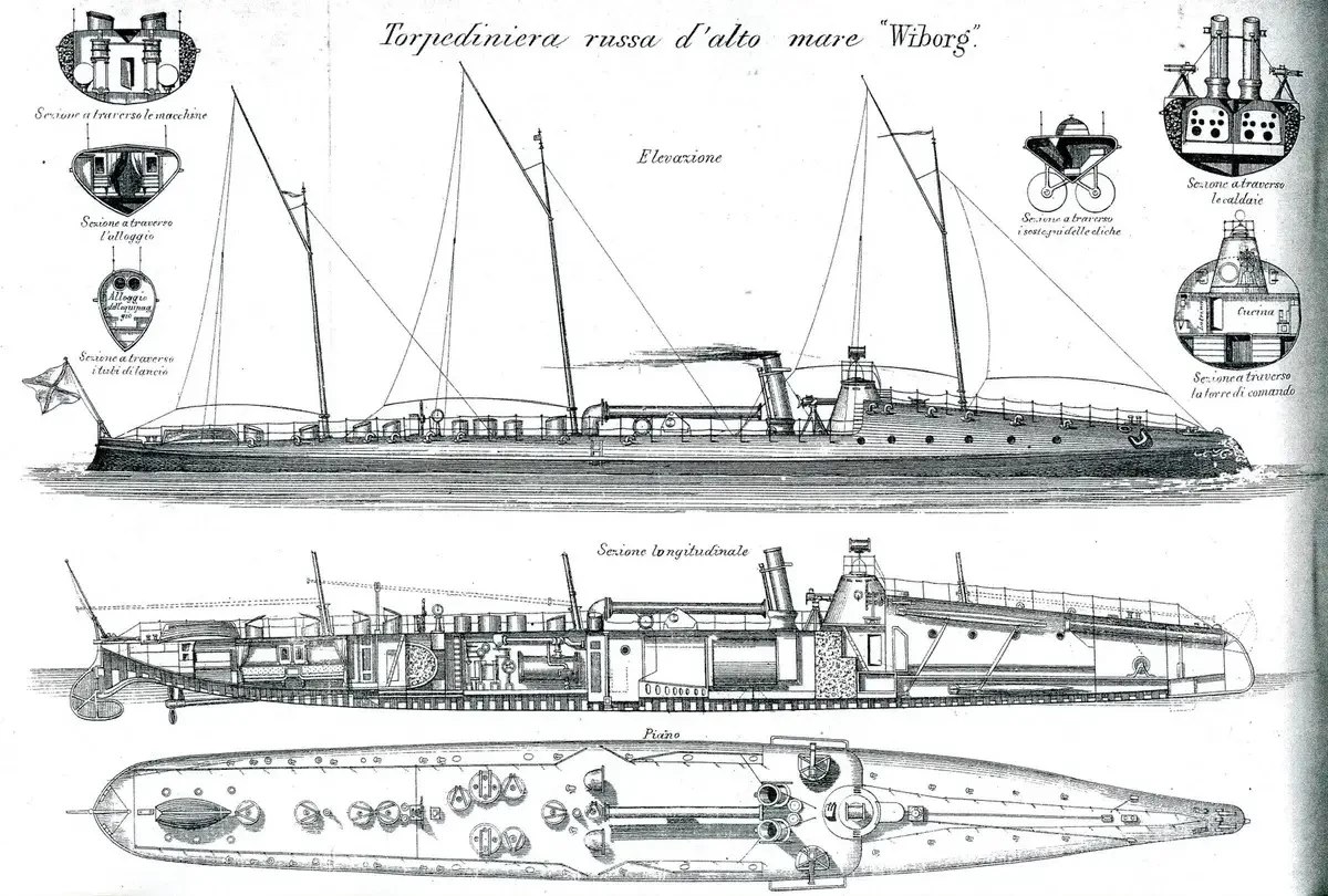 Следующий миноносец, 125-тонный «Выборг», было решено заказать в Англии. С «Ярроу» договориться не получилось (в очередной раз произошло обострение отношений с Британией), и заказ достался фирме «Джеймс и Джордж Томсон», предложившей построить корабль дешевле. Проект показался русскому Морскому ведомству интересным: компания предложила несколько новшеств, типа установки электрического прожектора. Но не имевшая опыта компания заказ выполнила не самым качественным образом, так что продолжения «Выборг» не получил. Далее последовала ещё одна серия из двух кораблей: «Ревель» и «Свеаборг». Здесь уже начинает прослеживаться не самая хорошая тенденция в технической политике МТК. Если строить первые корабли в качестве опытных логично, то далее... Становится видно, что должного внимания русское морское министерство миноносцам не уделяет. Особенно на фоне ушлых соседей...