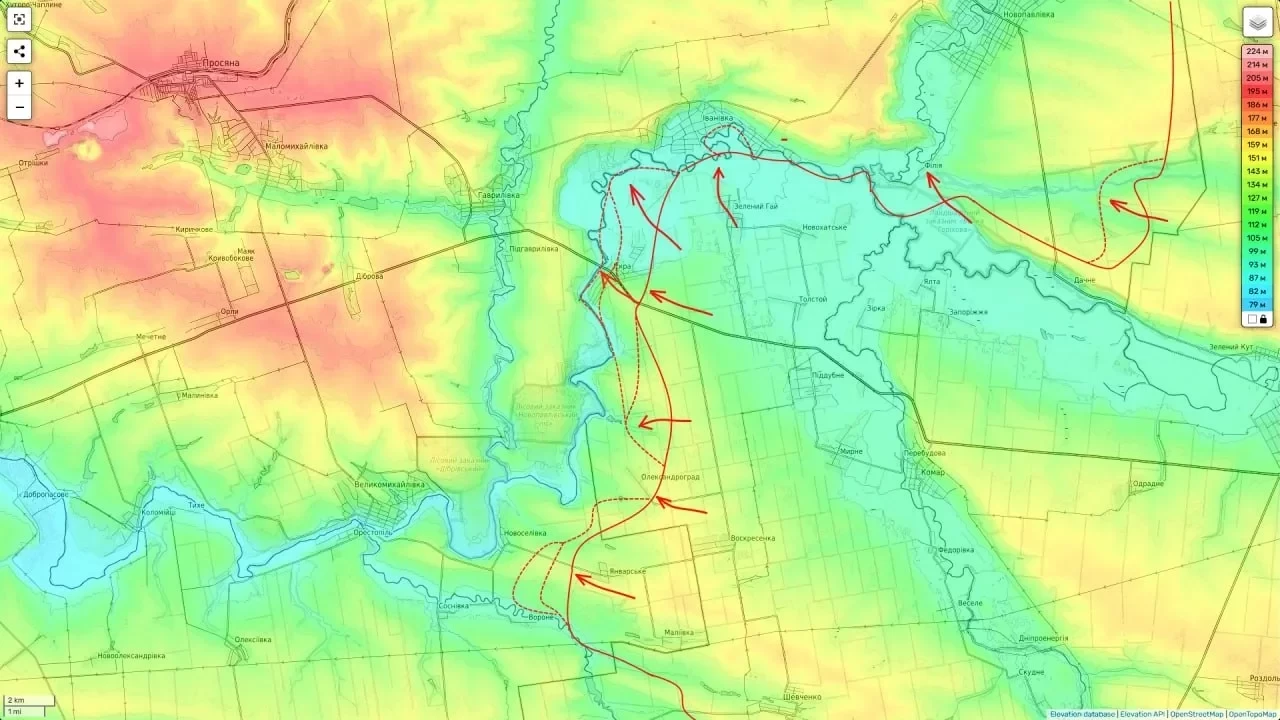 На опубликованной карте видно, что российские войска продвигаются с северо-востока к Васильевке, откуда могут повернуть на юг к Гришино и полностью перерезать трассу Днепропетровск - Красноармейск.