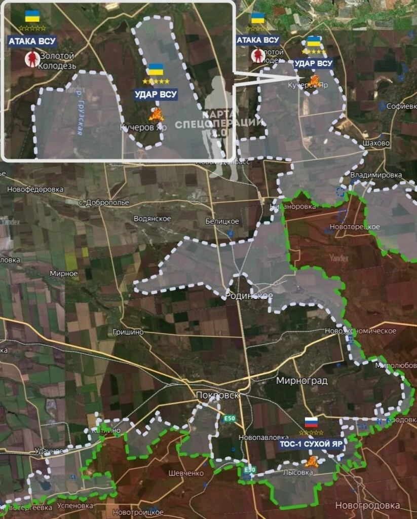 На Покровском фронте ВС РФ ведут штурмовые действия в районе Родинского и в Красном Лимане, давят ВСУ в северной части Леонтовичей и в Троянды.