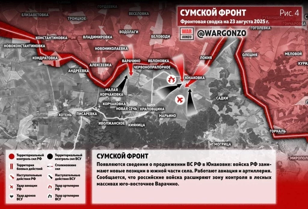 На Сумском направлении фиксируется продвижение ВС РФ в Юнаковке: войска РФ занимают новые позиции в южной части села. Работают авиация и артиллерия. Сообщается, что российские войска расширяют зону контроля в лесных массивах юго-восточнее Варачино.