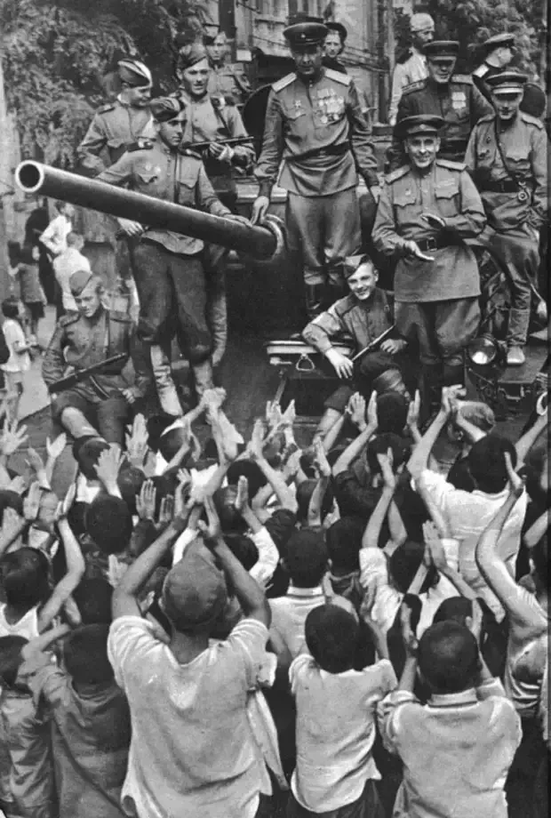 Китайцы приветствуют советских танкистов в освобожденном городе Далянь (Дальний)