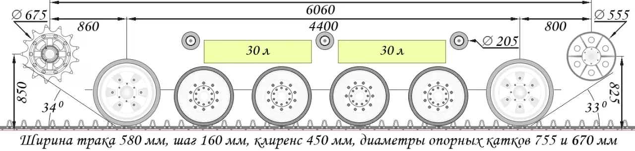 В качестве движителя отлично подойдёт гусеница 172.55.010сб-2 с повышенными ресурсом и сцепными свойствами, параллельными резинометаллическими шарнирами (РМШ), со штампованными траками, разработанная в ходе ОКР «Рамка-99» (БМПТ). Так как ТБМП будет значительно легче любого из двух основных танков, то разумная экономия веса должна только приветствоваться. В качестве первого и шестого опорных катков с каждого борта используем обычные опорные катки (не усиленные) от Т-90 диаметром 755 миллиметров и весом по 194 килограмма. На позициях 2-3-4-5 установим опорные катки от Т-80 диаметром 670 мм и весом по 120 кг. Столь необычное сочетание позволяет немного облегчить общий вес ходовой части и несколько снизить сопротивление качению гусеничного движителя в целом путём увеличения диаметра первых и последних опорных катков, как на английском танке «Валентайн».