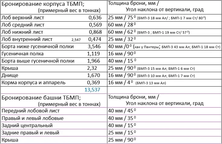Прежде всего необходимо определиться с весовой категорией предполагаемой тяжёлой боевой машины пехоты. Абстрактный российский основной танк в современности достиг психологического и символического предела в массе порядка 50 тонн с промышленными и кустарными доработками по защите, начиная от дополнительного обвеса динамической защитой, установки различных вариантов активной защиты, нештатных систем РЭП и заканчивая разнообразными «мангалами». Судя по опыту применения на Украине тяжёлых танков западного производства, вряд ли найдутся сторонники дальнейшего роста массы российского основного танка за пределы 50 тонн.