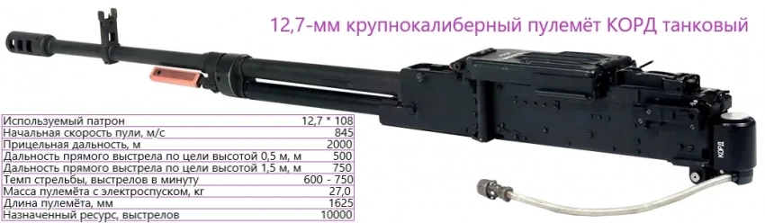 Если основным вооружением БМП является 75-мм орудие, то вспомогательным условно можно назвать два 12,7-мм пулемёта 6П49 и 6П51 «Корд» — танковые пулемёты с правосторонним и левосторонним питанием. Практически при одинаковых начальных скоростях пуль в сопоставлении с традиционным спаренным пулемётом ПКТМ энергия крупнокалиберной пули выше в пять раз по сравнению с пулей винтовочного калибра. На расстоянии в 600 метров это превосходство ещё более впечатляющее: скорость полёта крупнокалиберной пули выше на 150 м/с, а энергия превосходит уже в девять раз.