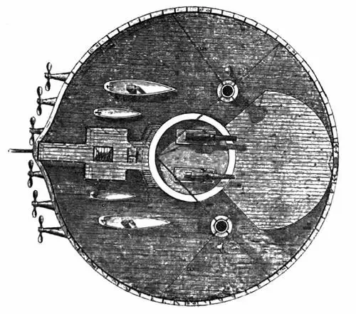 «Уменьшая длину и увеличивая ширину судна, можно не только уменьшить его денежную стоимость, но и увеличить водоизмещение. Доведя эту аксиому до конечной степени, то есть сделав длину равной его ширине, мы достигнем наиболее благоприятных условий — как в отношении стоимости, так и водоизмещения. Поэтому все ватерлинии его образованы из кругов. Из всех судов тип монитора наименее подвержен качке и представляет наименьшую площадь покрытия бронею; проектированное судно, как станок для орудий, есть монитор; оно имеет в центре неподвижную башню, которая покрыта бронею, так же как и палуба и борт судна...».