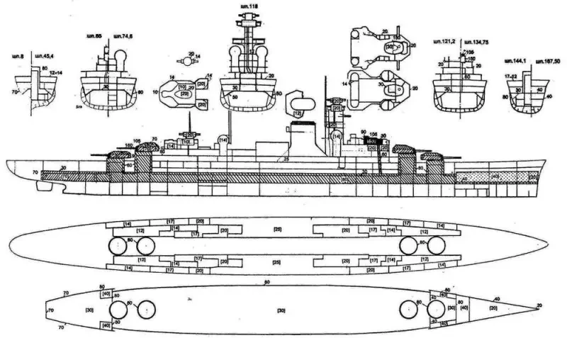 На мой взгляд, минимальные требования к защите тяжелого крейсера должны быть таковы. Его бортовая броня и палуба должны надежно защищать от снарядов калибром 6 дм и менее на дистанциях решительного боя, под которыми следует понимать расстояние не более чем в 70 кабельтов. Можно рассчитывать, что такая броня позволит крейсеру «держать удар» 8-дм снарядов на больших дистанциях при ведении боя на острых курсовых углах. Максимальными же требованиями является обеспечение защиты от 8-дм снарядов на дистанции 70 кбт и более. Что же до защиты башен, барбетов и боевой рубки тяжелого крейсера, они должны защищать от 8-дм снарядов не менее чем на 70 кабельтов.