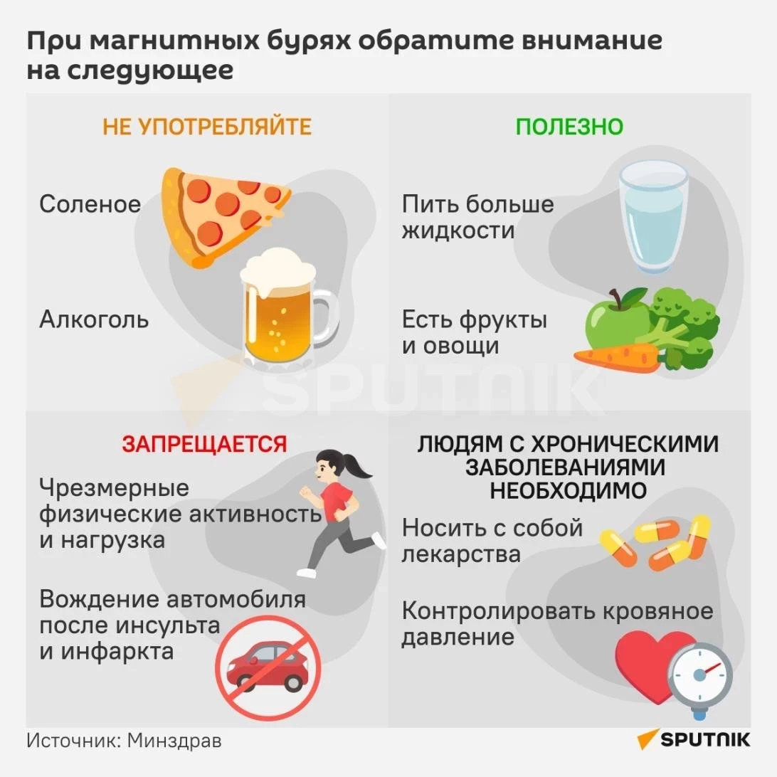 Учёные могут точно прогнозировать магнитные бури только на несколько часов вперёд, поэтому важно заранее позаботиться о здоровье. Во время геомагнитной активности могут возникать упадок сил, головные боли, смена настроения и боли в суставах.