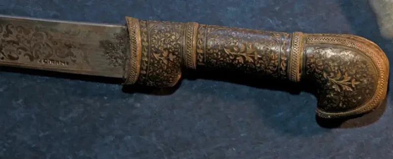 Черен рукояти из слоновой кости, покрытой сверху серебром. Однако при этом сам черен расколот трещиной, а его металлическая оправа порвана. Раздвоенная головка рукояти имеет птичкообразную форму. Нижняя часть рукояти для лучшего захвата пальцами руки оформлена в виде упора. Ножны деревянные, обтянутые кожей. Металлический прибор ножен изготовлен из серебра и состоит из устья, двух ажурных в виде розеток обоймиц с кольцами для крепления ремней портупеи и наконечника с бородкой, украшенных чернением и растительным орнаментом.
