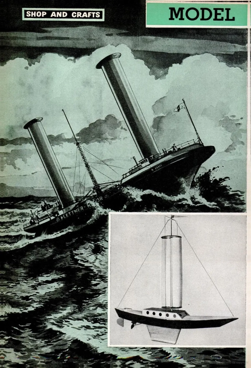 Открываем журнал «Популярная механика» 40-50-ых годов прошлого века, а там, например, рассказывается о так называемом «роторе Флеттнера», оригинальном устройстве, позволяющем использовать силу ветра для вращения гребного винта судна. Ещё его называют турбопарус, причём впервые на корабле это изобретение немецкого инженера Антона Флеттнера было использовано ещё в 1924 году на шхуне «Букау». Вид у корабля получился более чем оригинальный, однако он плавало, причём довольно успешно.