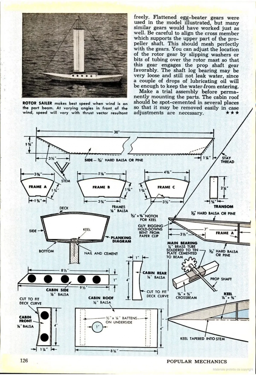 Ну а в случае с моделью всё просто: ветер вращает турбопарус, а от него вращение передаётся на гребной винт. Впоследствии точно такая же модель рекомендовалась к постройке и в журнале «Моделист-конструктор».