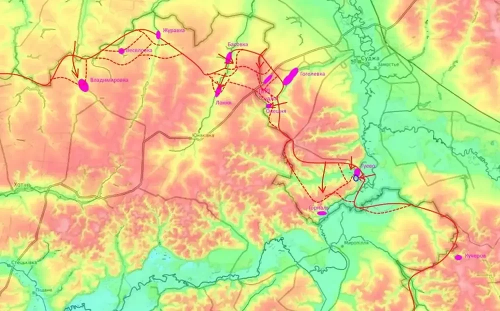 Одновременно, другая группировка ВС РФ, приблизительно в 15 км по прямой северо-западнее, прорвала украинскую оборону и вошла в село Локня Сумской области. Российские войска продвигались на юг со стороны Басивки этого же региона и закрепились в северной части Локни. На момент написания материала идет бой за центральную часть упомянутого села. После успешного овладения Локней, ВС РФ смогут продвинуться к Юнаковке и главному логистическому пути ВСУ в этой местности, автодороге Н-07, из Сум в сторону госграницы России.