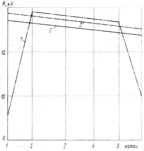 Рис. 3. Нагрузка на опорные катки БМП-3: 1 — на грунт; 2 — на ось катка; 3 — на шины