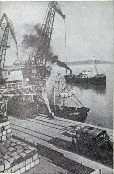 Погрузка хлопка на суда в порту Красноводска до войны: транспортёр подавал кипы с хлопком на пристань, а оттуда краном в судно