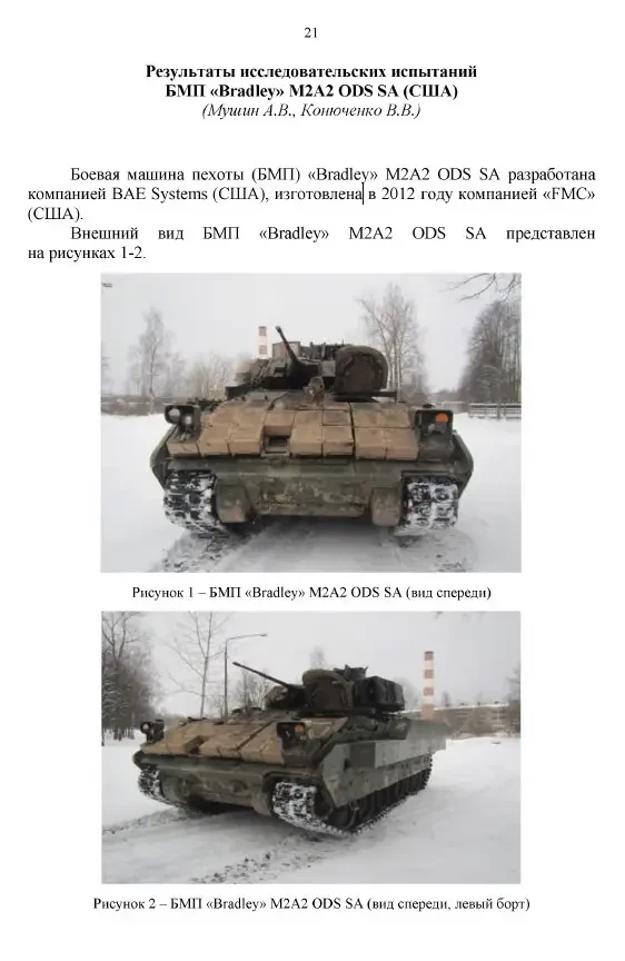 Удивительно, что до сих пор так никто и не подготовил развернутое опровержение откровенно провокационной публикации, именуемой как «Результаты исследовательских испытаний БМП «Bradley» M2A2 ODS SA (США)». Указанные авторы — некто Мушин А. В. и Конюченко В. В. Комментаторы указывают исполнителей доклада в качестве сотрудников НИИ-38 в Кубинке. Эксцесс с появлением материала случился 6 апреля и вызвал настоящую бурю в интернете.