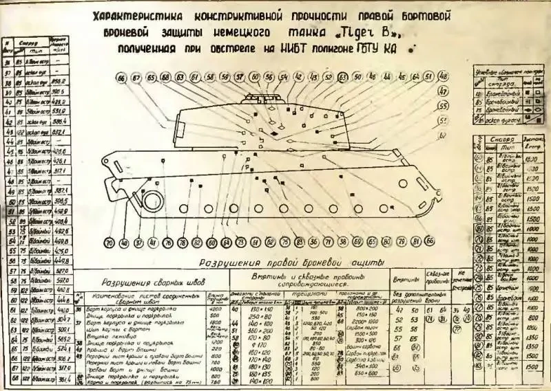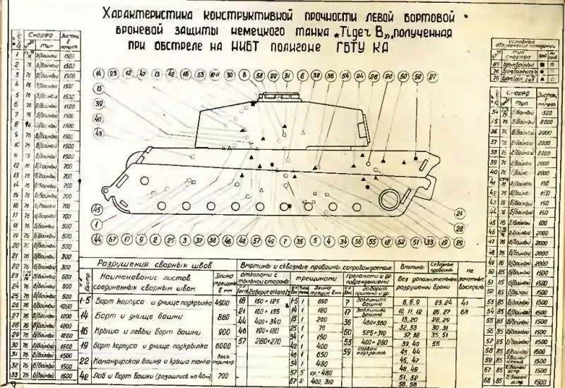 Если бы Bradley действительно обстреливалась указанными боеприпасами (и не только) по указанным проекциям, да еще и по всем правилам, то на машине не осталось бы живого места. Не забываем, что «американца» должны были еще и подорвать не один раз – соответствующий стенд в Кубинке точно имеется. Но ни одного доказательства такого перфоманса авторы не привели. Как и не показали результатов аналогичного обстрела БМП-3. Для примера приведем итоги исследовательской работы советских артиллеристов по «Королевскому Тигру». Наглядность, почти не требующая комментариев.