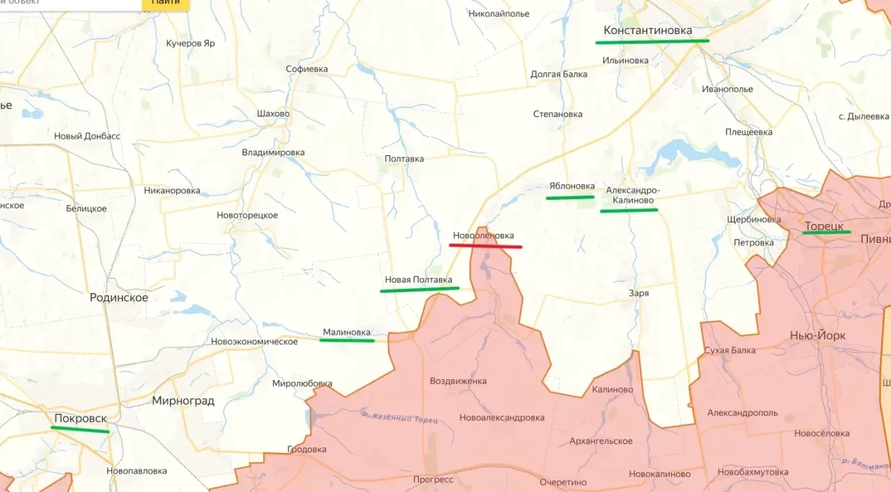 К юго-западу от Новоеленовки российские подразделения продолжают штурмовые действия в Новой Полтавке и Малиновке, освобождение которых также означает выход наших войск к трассе Красноармейск-Константиновка.