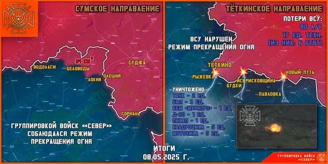 Несмотря на соблюдение группировкой войск "Север" режима прекращения огня, враг только с момента объявления перемирия девять раз пытался прорваться вглубь территории России (шесть раз в тёмное время суток и три в дневное) на направлении посёлков Тёткино и Новый Путь.