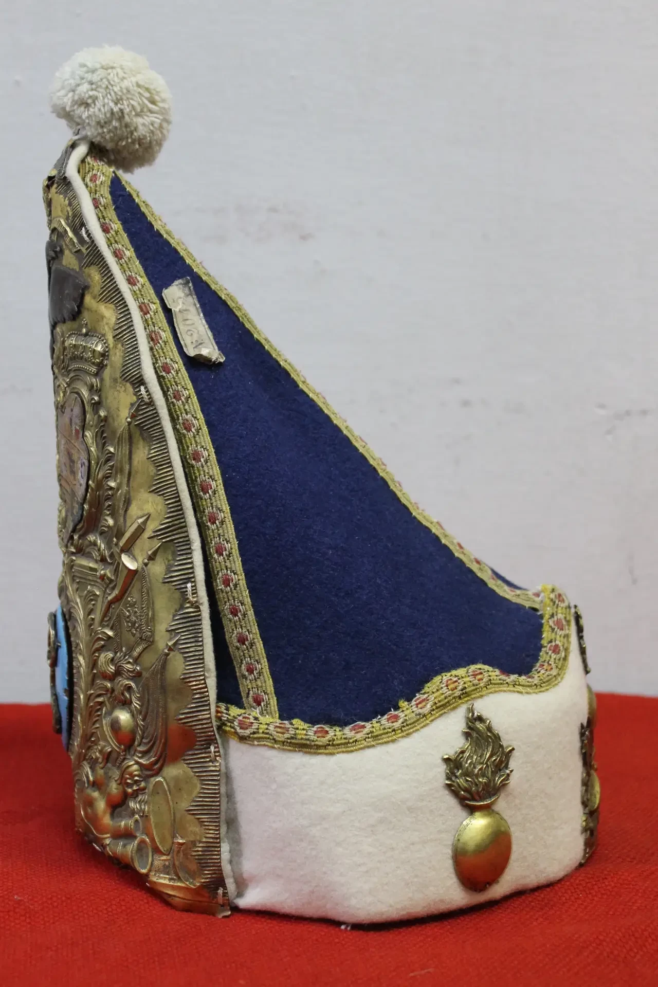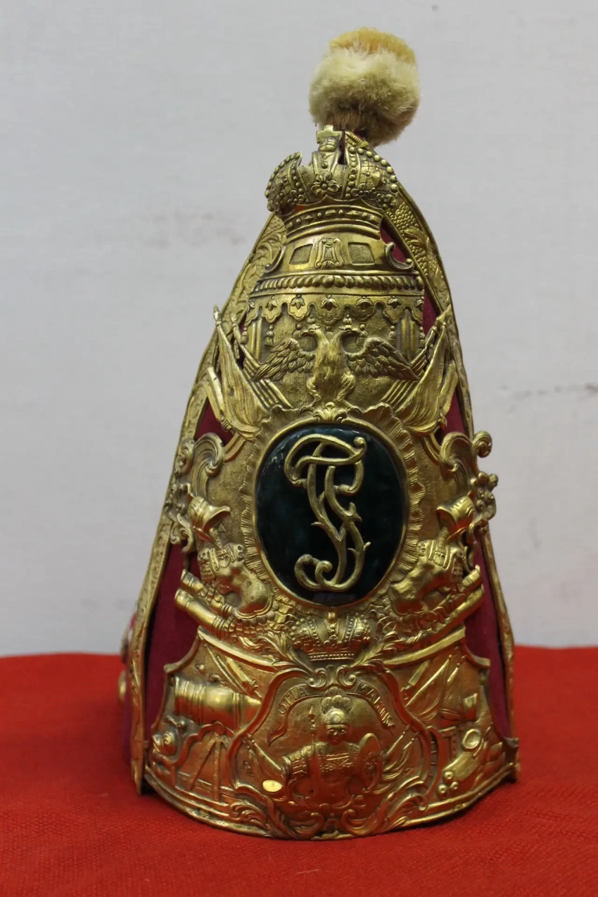 Митра офицера конных гренадеров Лейб-драгунского полка Гоштинской гвардии Петра III. Ткань, дерево, бронза, золочение, эмаль, краска. Диаметр основания 191 мм. Высота 297 мм. Материалы: сукно, дерево, бронза, позолота, эмаль, краска. Особенностью ее оформления являются целых три герба! Двуглавый орел в верхней части и два герба под ним. Российский справа, и герб Петра III - наследственный голштейн-готторпский герб слева. Внизу новый вензель – одна буква «П» на голубой эмали. Наверное, это самая красивая митра за всю историю их использования в российской армии. Пензенский областной краеведческий музей. Фотография автора