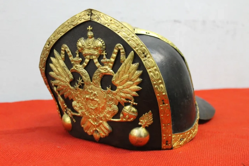 Митра-гренадерка голштинской гвардии Петра III до восшествия на российский престол. Судя по оформлению и приборным цветам, принадлежала обер-офицеру гренадерского батальона Эссена.Наналобнике вензель, составленный из латинских букв «P» (Пётр) и «F» (Фёдорович). Пензенский областной краеведческий музей. Фотография автора