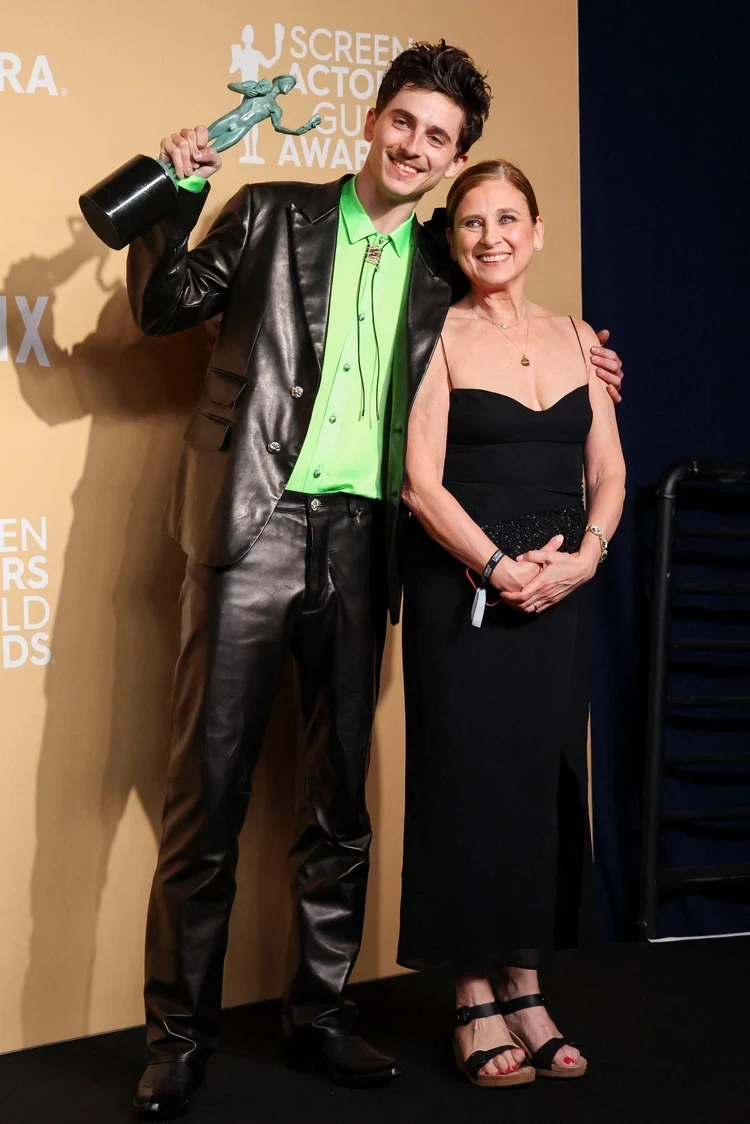 Тимоти Шаламе, который стал обладателем награды в номинации «Лучшая мужская роль» за фильм «Никому неизвестный», пришел на премию вместе с мамой. Николь очень радовалась победе сына. Для выхода на дорожку 29-летний Тимоти выбрал кожаный костюм от американского люксового бренда Chrome Hearts, который сочетал с кислотно-зеленой рубашкой и ковбойским галстуком.