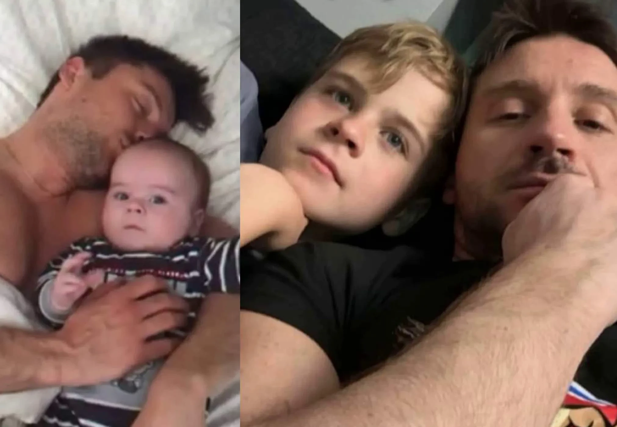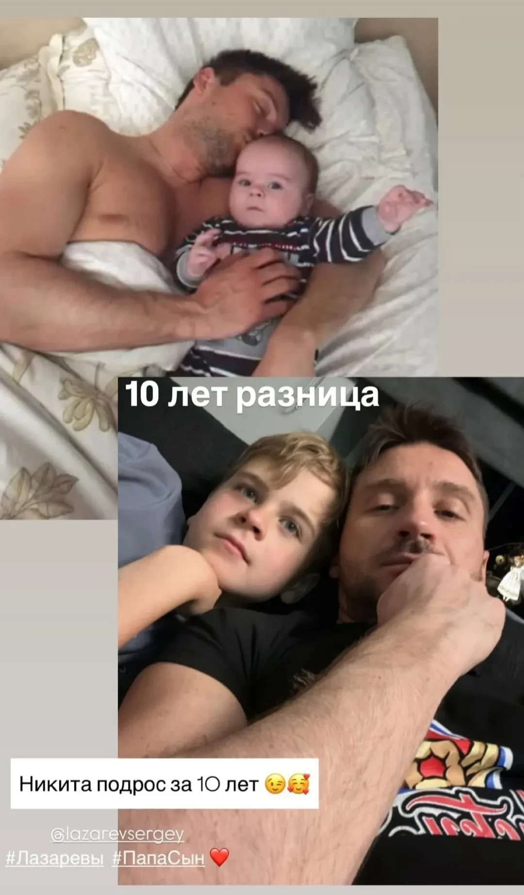 На обоих снимках отец и сын лежат вдвоем на кровати, только на свежем фото Никите уже 10 лет, и в нем сложно узнать малыша с архивного кадра.