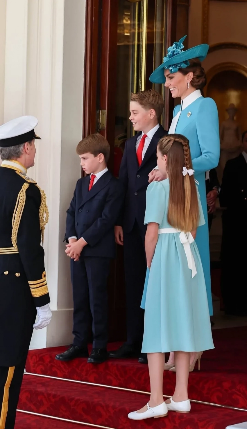 Кейт Миддлтон с детьмиКейт Миддлтон и принцесса ШарлоттаКейт Миддлтон с детьмиПринц Уильям по традиции был в форме и верхом на лошади, а его супруга ехала в карете вместе с их тремя детьми: принцами Джорджем и Луи и принцессой Шарлоттой, на которой было платье в тон наряда ее матери. Карл III тоже предпочел занять место в карете из-за состояния здоровья: монарх сейчас лечится от онкологического заболевания.