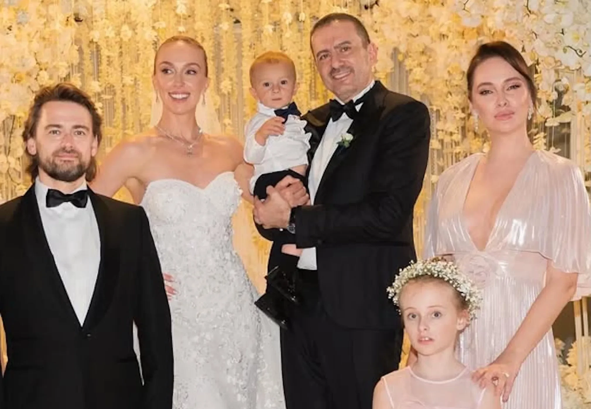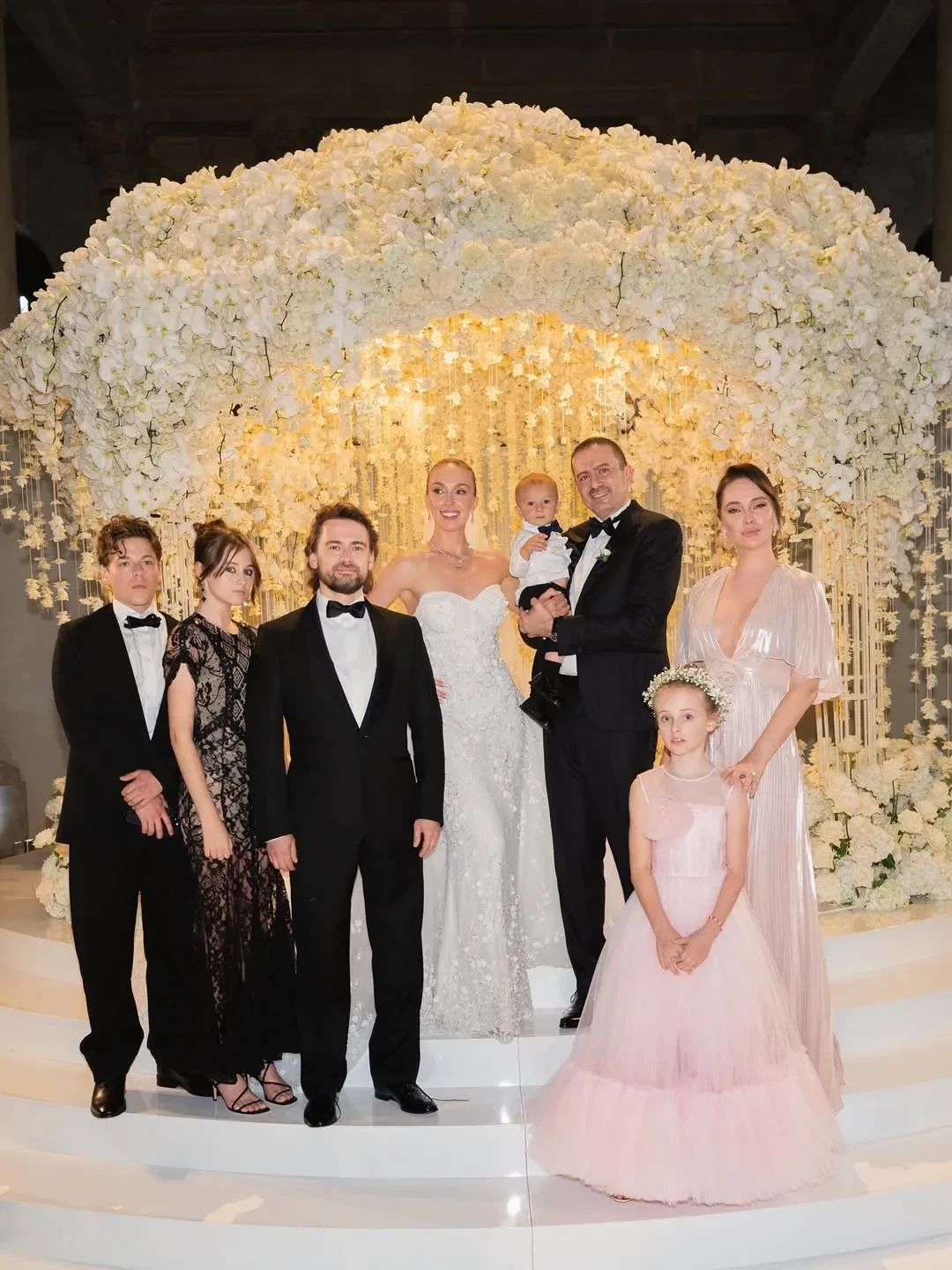 Ирина и Борис Зарьковы с детьми, Дина с женихом и сыномДинаСвадьба Дины и ДанаНевеста с отцомВ Венецию специально прилетели шеф-повара альянса Бориса Зарькова White Rabbit Family (WRF). Для праздника, как рассказала Ирина Зарькова, заказали 46 килограммов икры, тысячи живых цветов, четыре автобуса шаманского из Франции и организовали лодки для 170 гостей, а платье невесты от Georges Hobeika шили почти год.