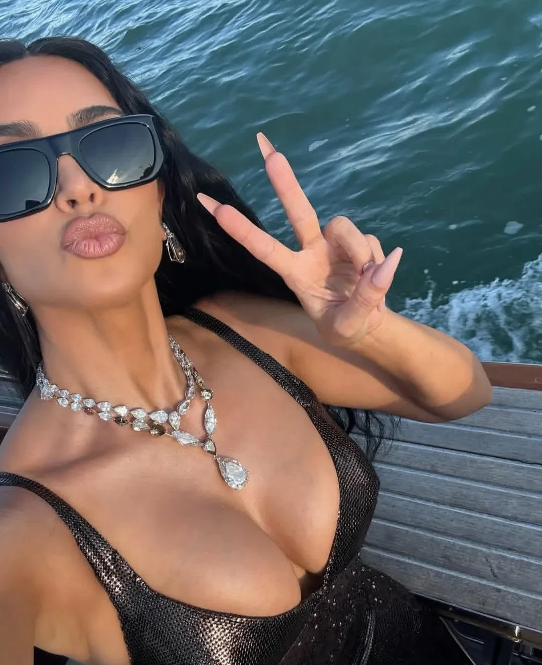 На днях 44-летняя Ким Кардашьян опубликовала в соцсетях фотографии со свадьбы Лорен Санчес и миллиардера Джеффа Безоса, где она была одной из приглашённых. Поклонников звезды особенно заинтересовали украшения на её шее.