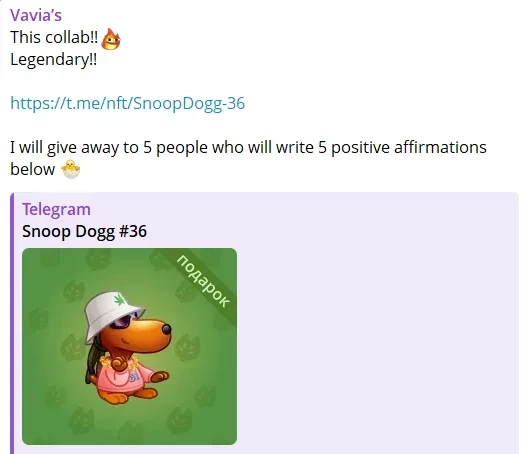 Пост Юлии Вавиловой в TelegramСудя по всему, недавняя перепалка между Снуп Доггом и Павлом Дуровым была своеобразным прогревом перед запуском совместной коллаборации. Напомним, тогда музыкант обратился к Дурову с призывом перестать плодить детей, а тот в ответ предложил Снупу продолжить разговор в Telegram.