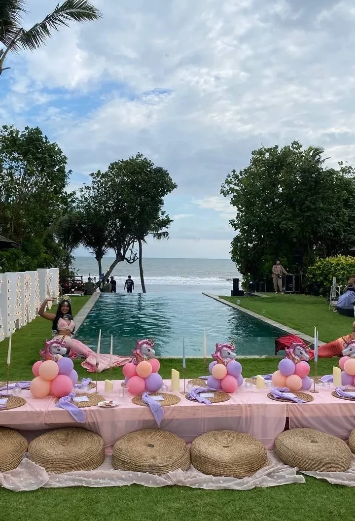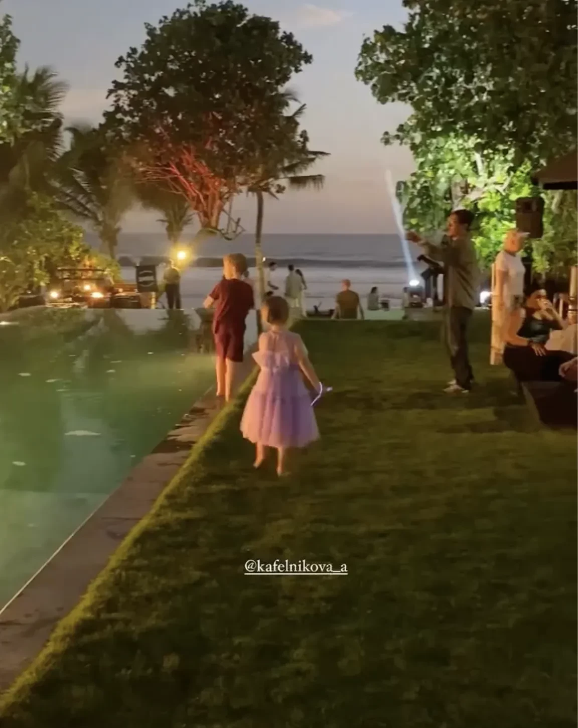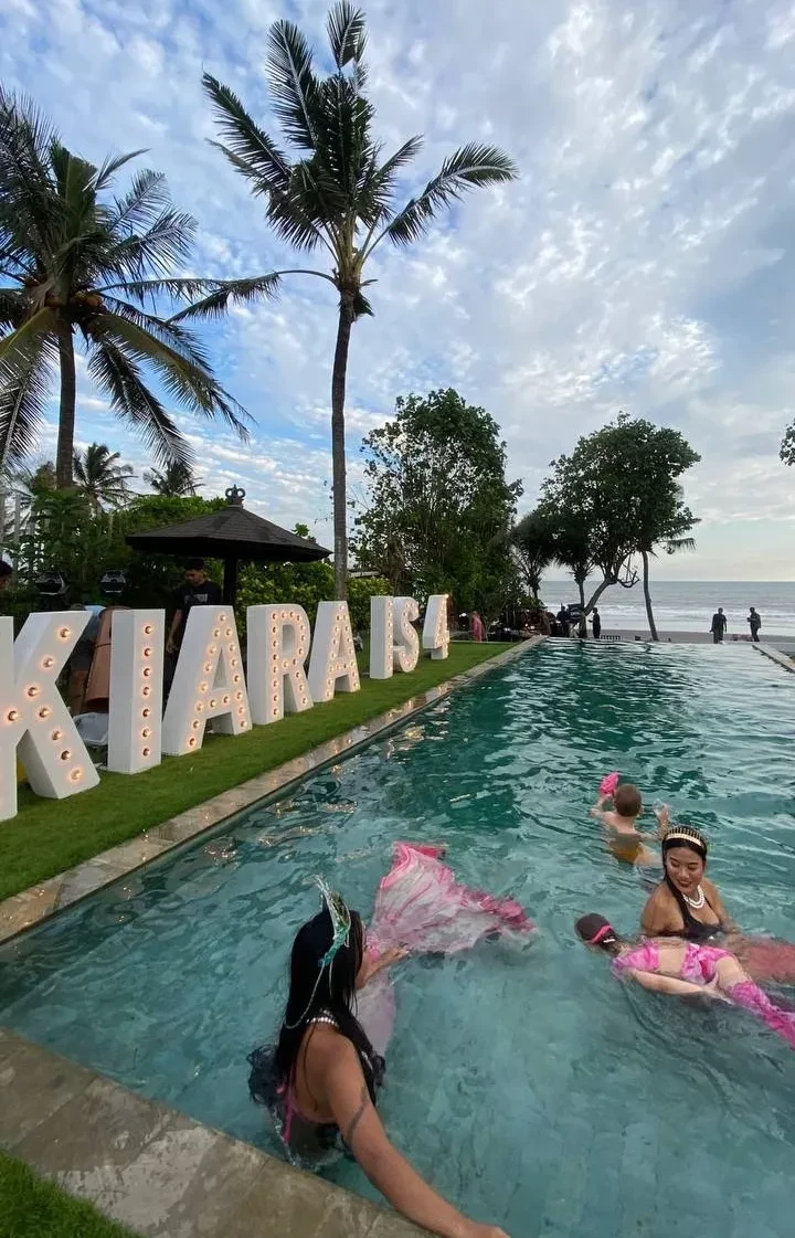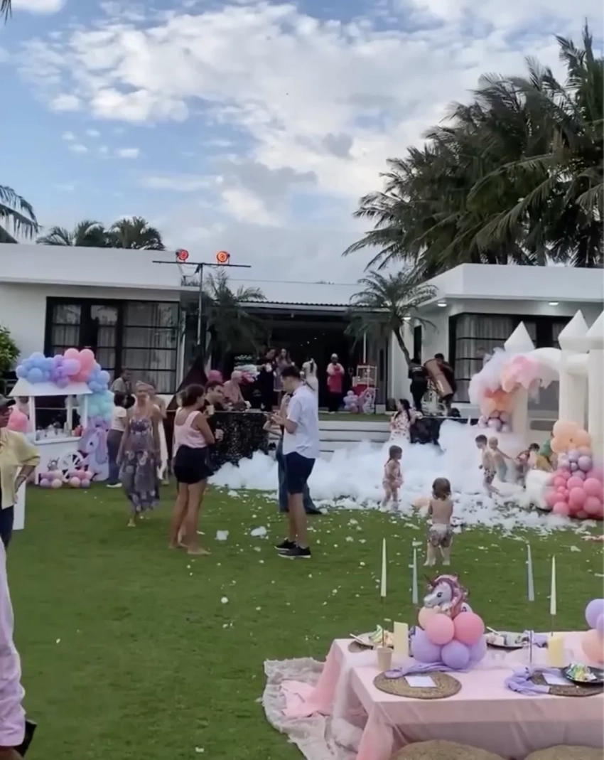 Алеся Кафельникова и Георгий Петришин с дочерьюДень рождения Киары прошёл на берегу океана, предположительно на Бали, где Кафельникова часто живёт с семьёй. Территорию у бассейна украсили надувной замок и воздушные шары. Детей и взрослых развлекали аниматоры-русалки, угощали разноцветным тортом, а вечером был фейерверк на пляже.