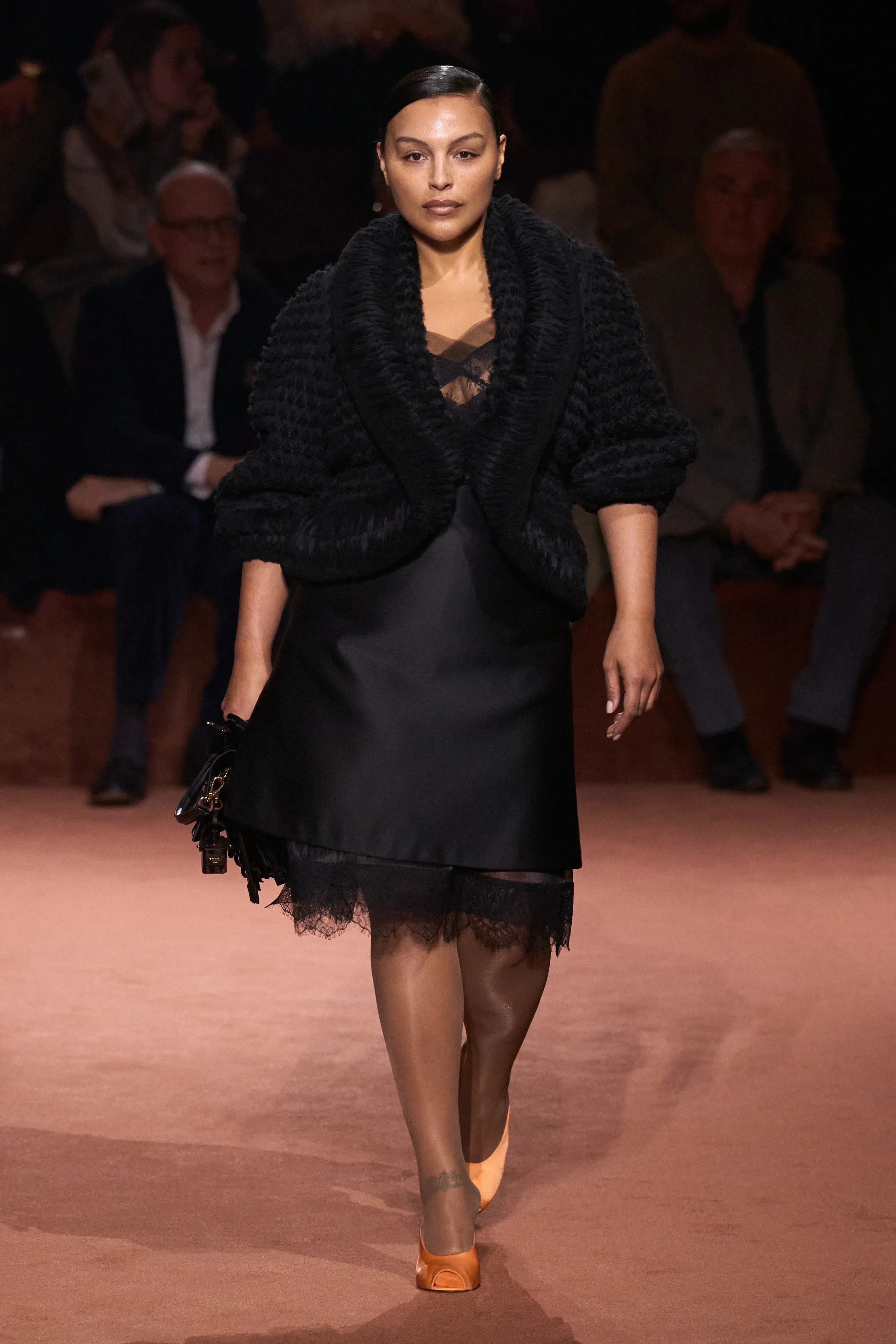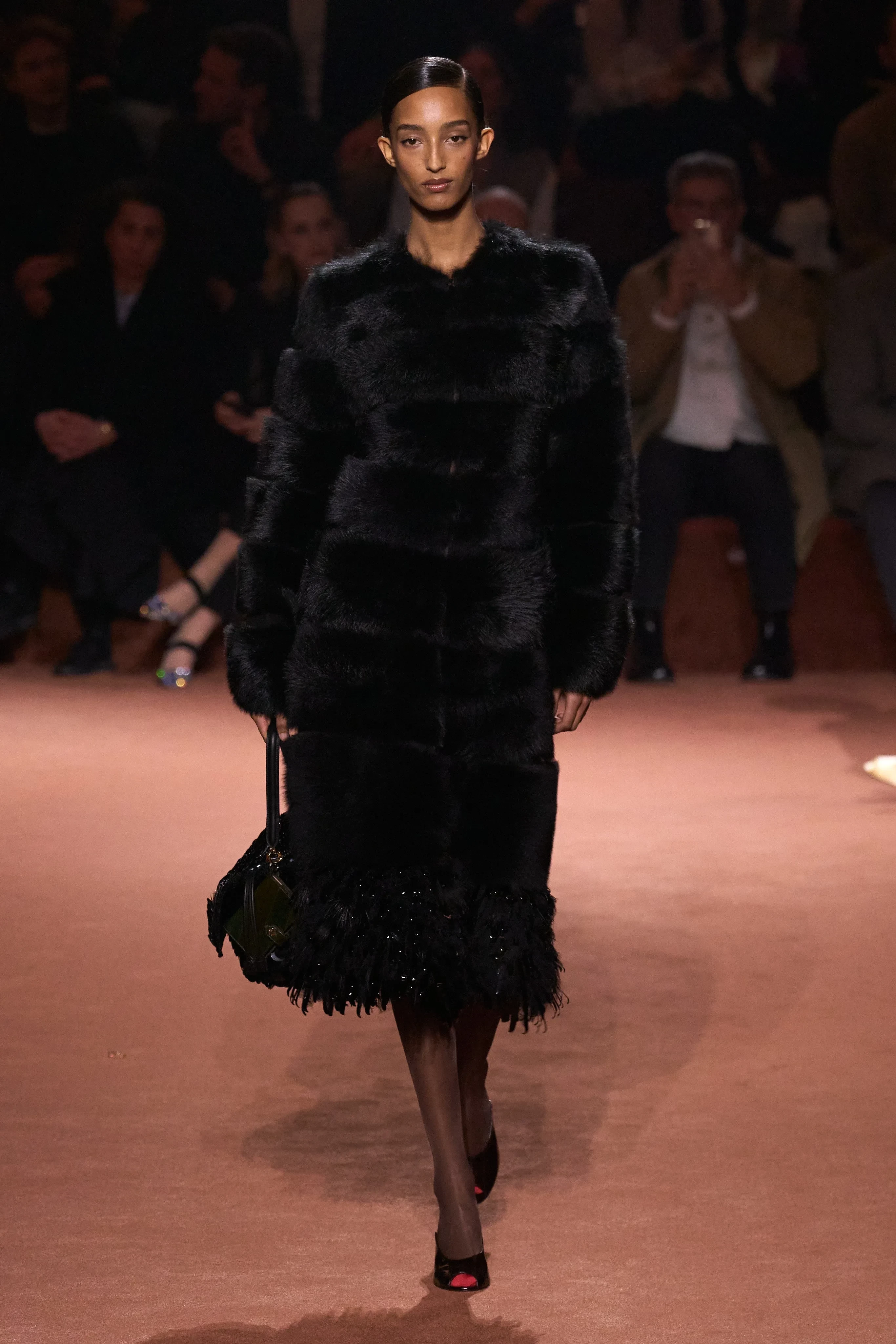 Креативный директор модного дома Сильвия Вентурини-Фенди представила коллекцию из 85 луков. Главный акцент она сделала на меховых изделиях и вышивке из драгоценных камней, которыми были расшиты юбки, платья, пальто и обувь. В коллекции также много вещей из кожи, полупрозрачных тканей и "возрастных" силуэтов. Яркой деталью образов стали телесные капроновые колготки с мысами разных оттенков, которые "выглядывали" из туфель.