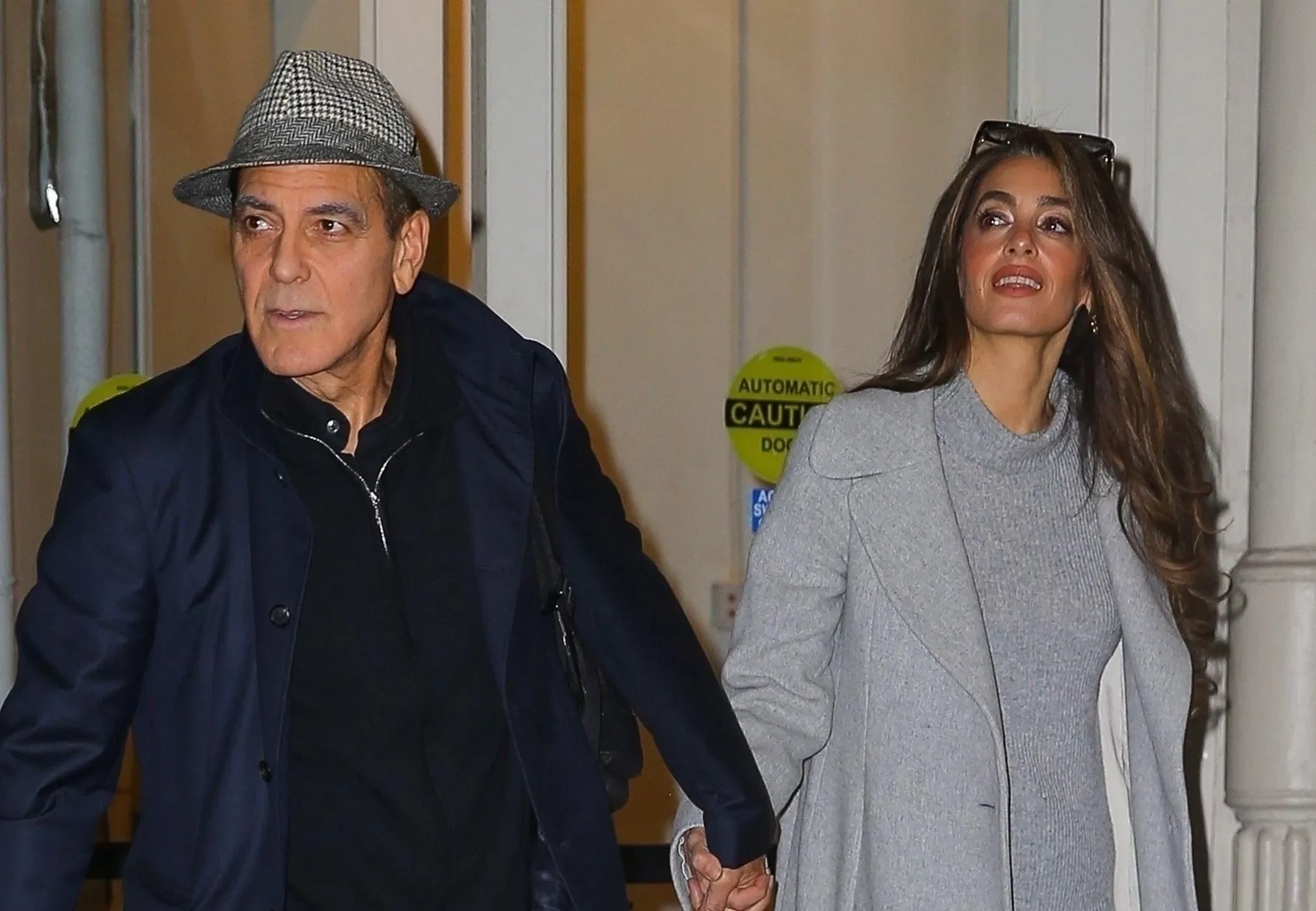 63-летний актер был одет в брюки, рубашку-поло и куртку темно-синего цвета, а его голову украшала серая клетчатая шляпа. На 47-летней Амаль было серое платье-свитер, серое пальто и черные ботфорты.