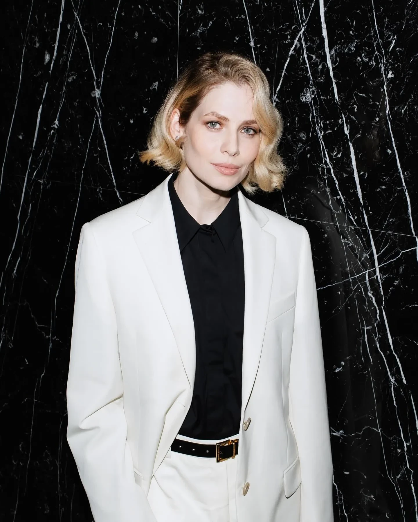 Для выхода в свет 41-летняя актриса выбрала белоснежный костюм с прямыми брюками и приталенным жакетом, который она надела поверх чёрной рубашки. Дополнили образ ремень с золотой пряжкой и лакированные туфли-лодочки в тон, а акцентом образа стал новый цвет волос, которые Снигирь уложила в мягкие волны.