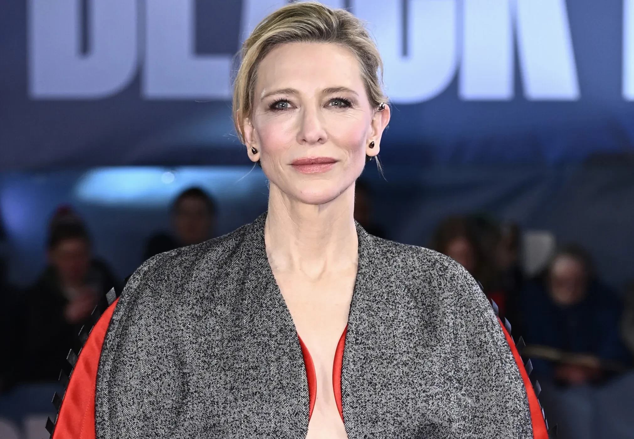 55-летняя Кейт Бланшетт надела приталенное платье из шерсти с красными рукавами, вырезом и открытой спиной. Платье сделал бренд Louis Vuitton, вдохновившись коллекцией осень-зима — 2023.