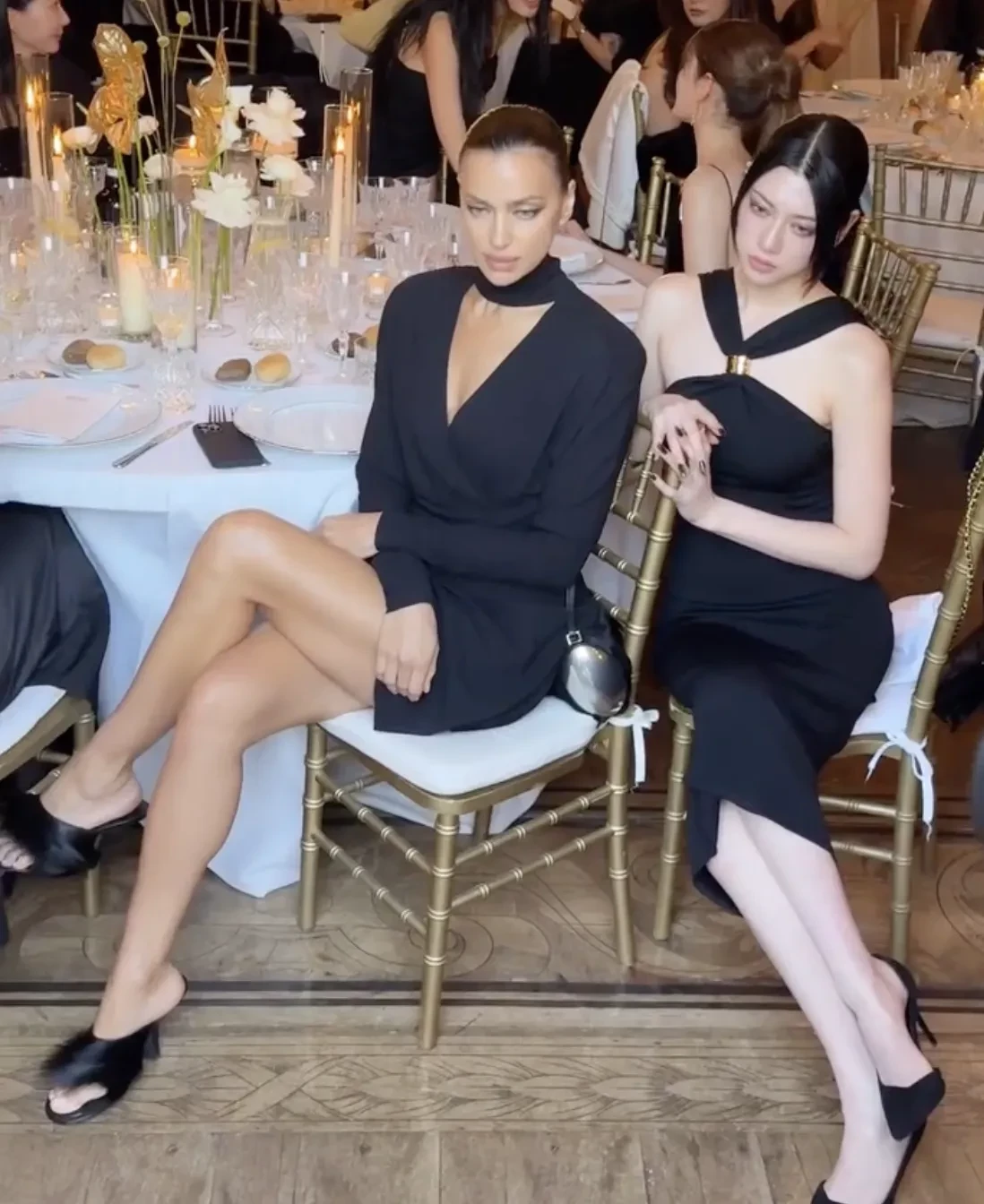 39-летняя Ирина позировала рядом с гостями в чёрном мини-платье и мюлях с мехом. Её образ дополнили сумка-багет и укладка с пучком. За столом Шейк сидела в компании представительницы бренда Яны Пак.