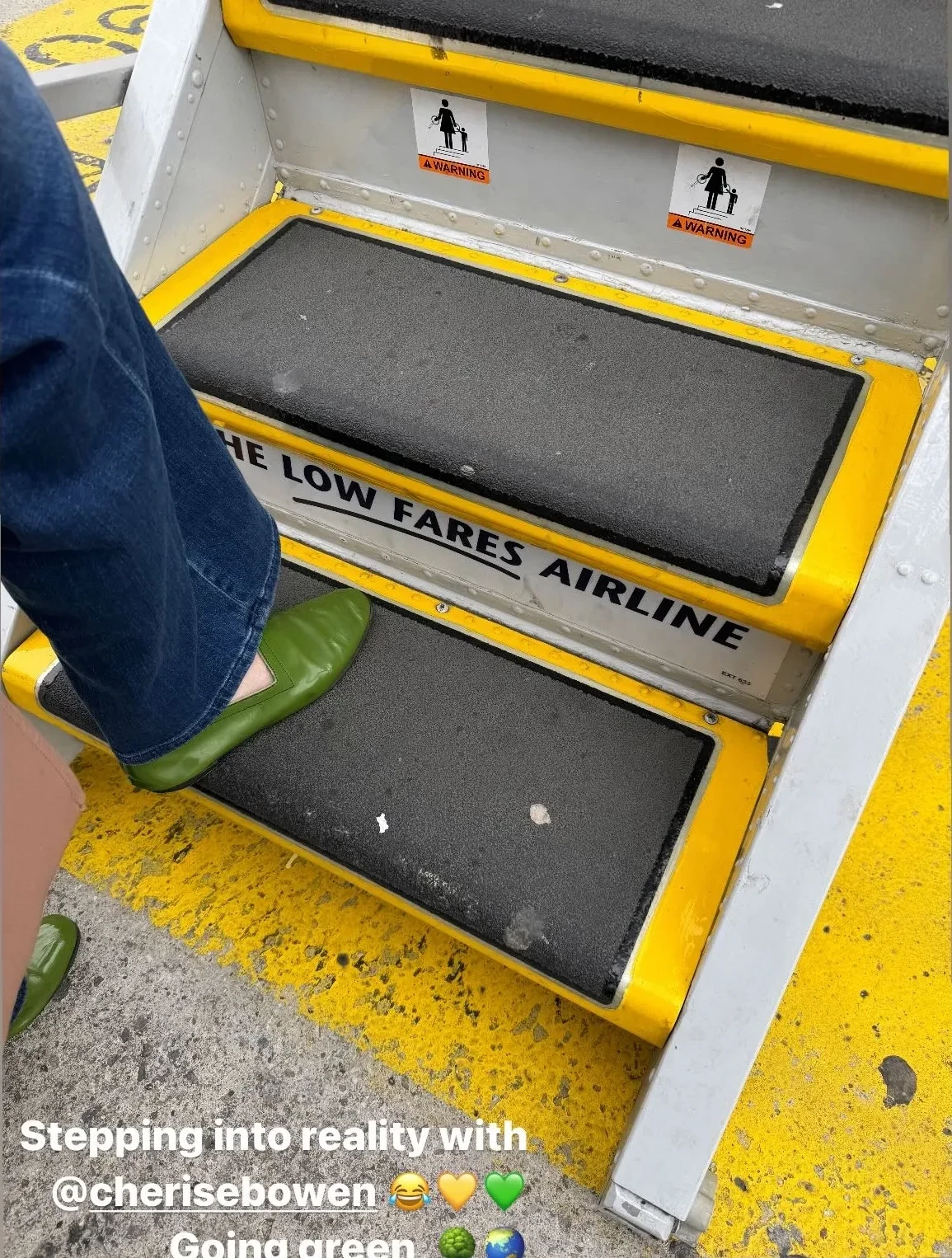 Фото Ирины Шейк"Шаг к реальной жизни. За экологичность", — подписала Ирина снимок с трапа самолёта, на ступенях которого написано: "Низкобюджетные авиалинии".