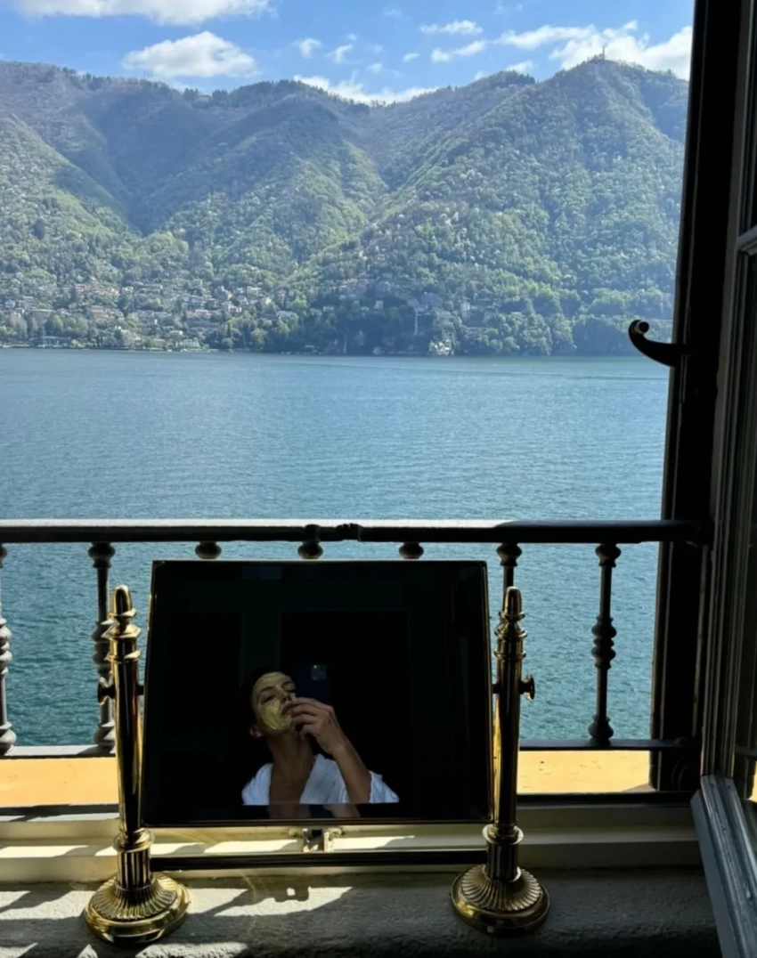 Шейк показала, как готовилась к гала-вечеру с помощью "золотой" маски для лица и остановилась в отеле с видом на озеро Комо. Также модель опубликовала фото своего образа и детали мероприятия, поделилась снимком визажиста Энрике Мартинса на фоне местных пейзажей и вскоре улетела обратно в Нью-Йорк. Но не частным самолётом, воспользовавшись статусом супермодели, а известной бюджетной авиакомпанией Ryanair.
