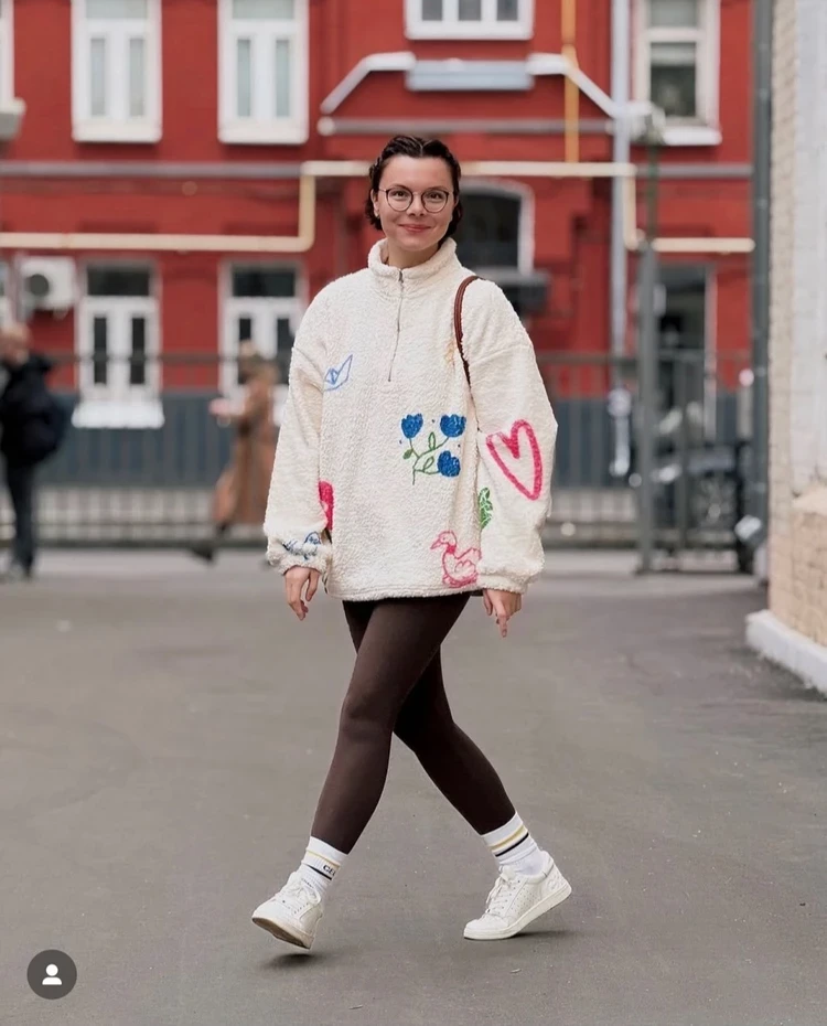 Татьяна демонстрирует расслабленный лук с элементами теннисного стиля. Объемную толстовку с детскими рисунками она сочетает с коричневыми лосинами. Дополняет образ спортивными кедами Chanel в сочетании с теннисными носками Celine. Конечно, жену Петросяна довольно непривычно видеть в полуспортивном луке, в котором она выглядит уже не как супруга юмориста, а, скорее, как внучка.