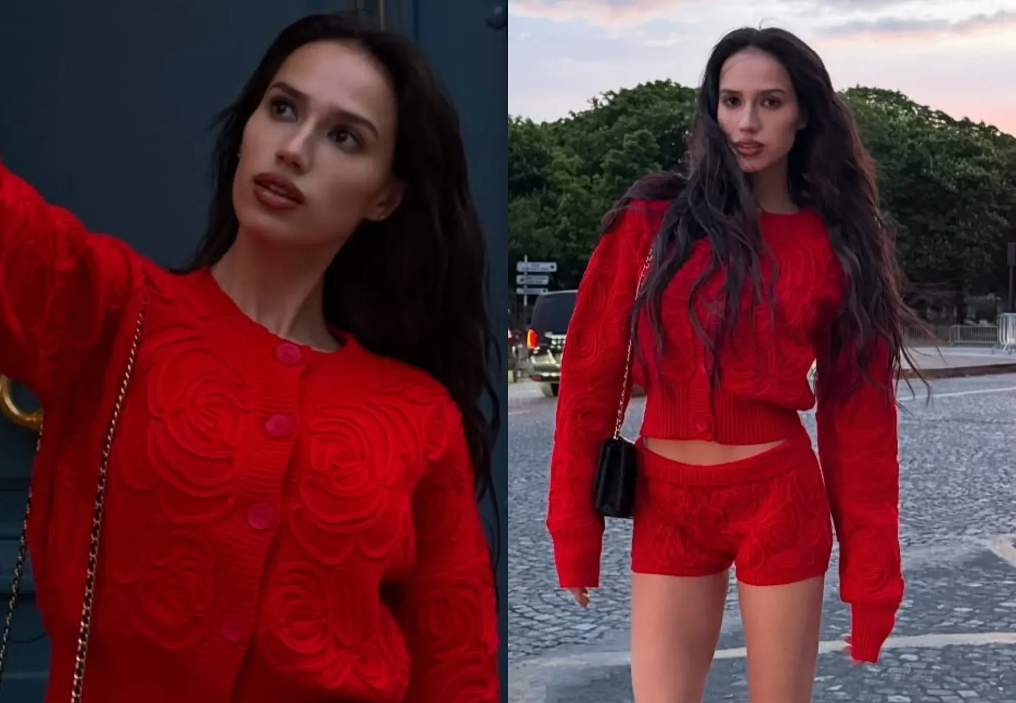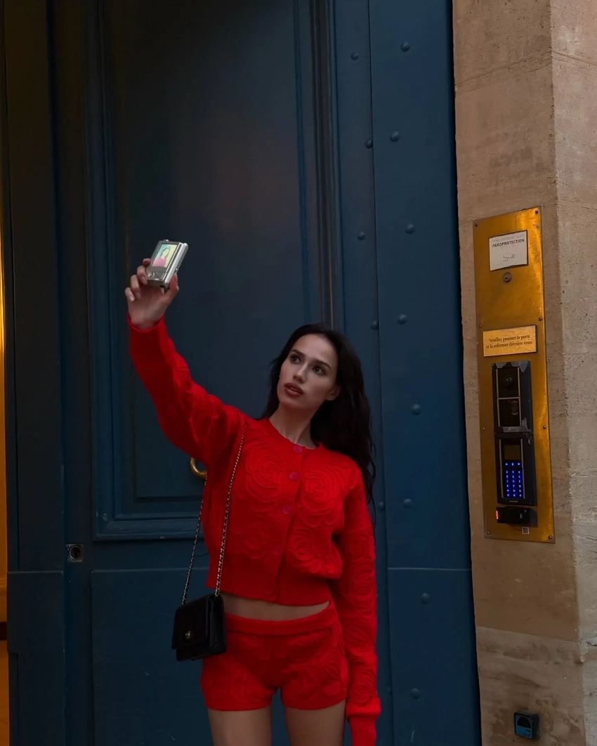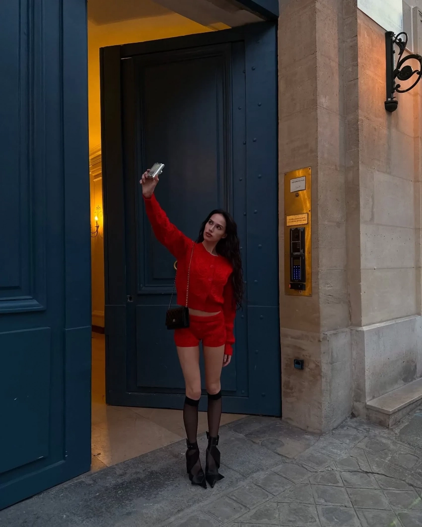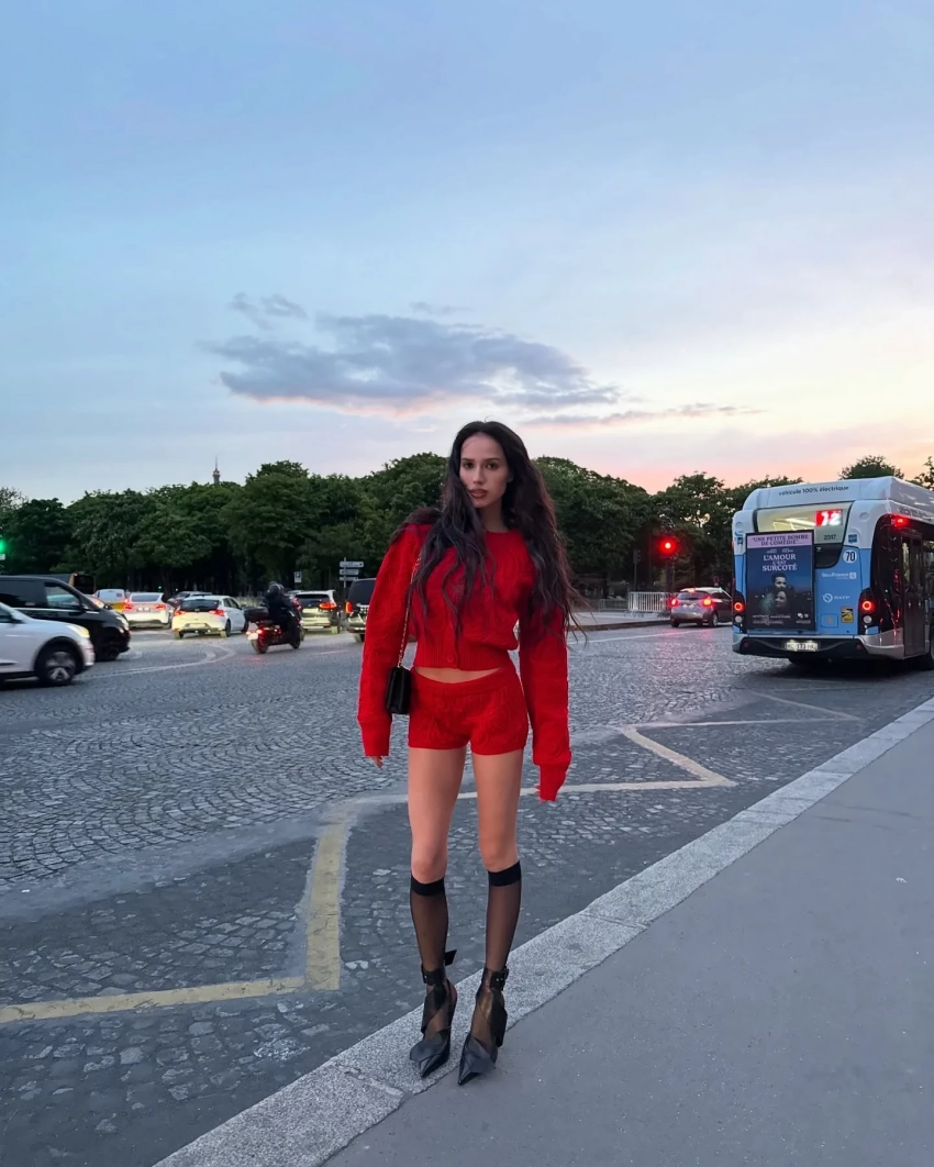 На новых снимках Алина позирует на улицах Парижа в красном жакете и микрошортах в тон. Образ она дополнила чёрными чулками и такого же цвета туфлями.