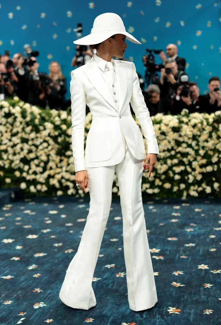 Кстати, белые комплекты предпочли многие гости. Так, 28-летняя Зендая облачилась в элегантный костюм-тройку, а сверху накинула белую шляпу.