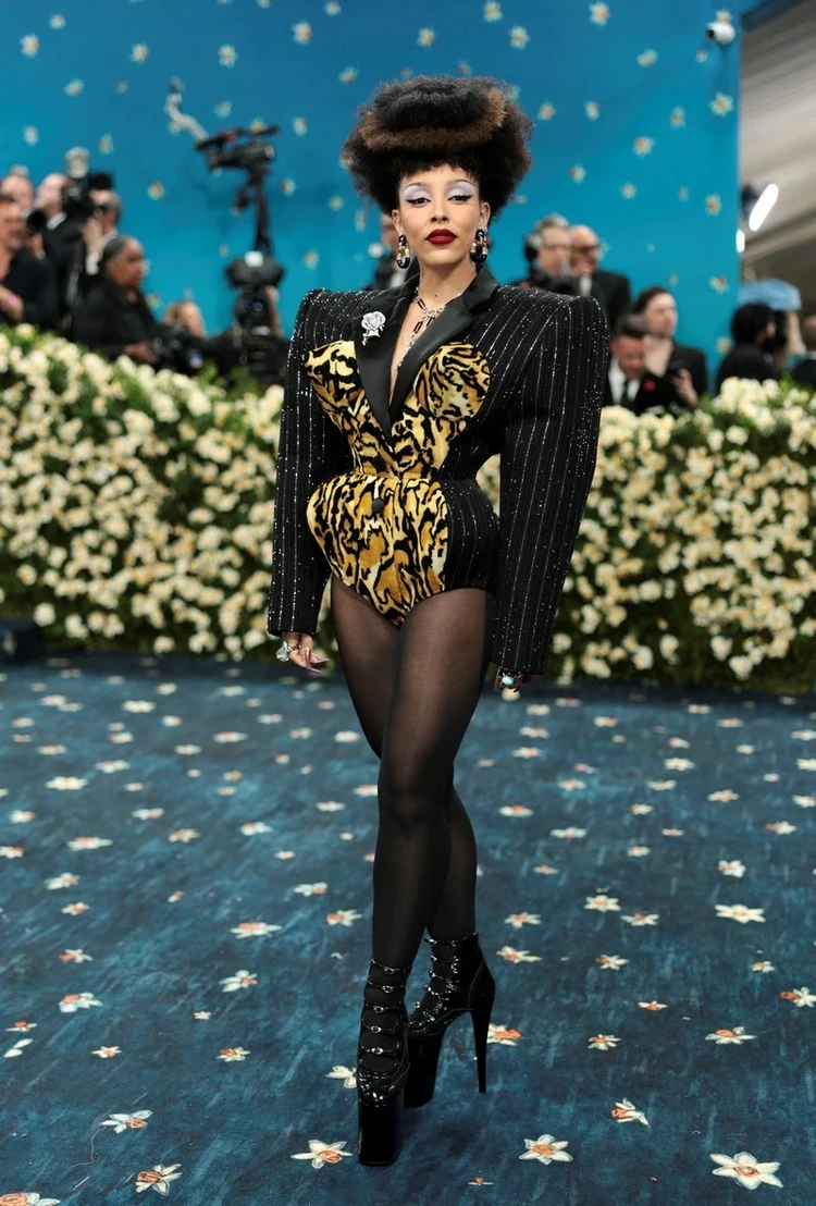 Другое дело — Доджа Кэт, которая выбрала необычный комбинезон, и, разумеется, костюмный. Особенность наряда была в том, что он выглядел, как тигровое боди, превращающееся в объемный пиджак.