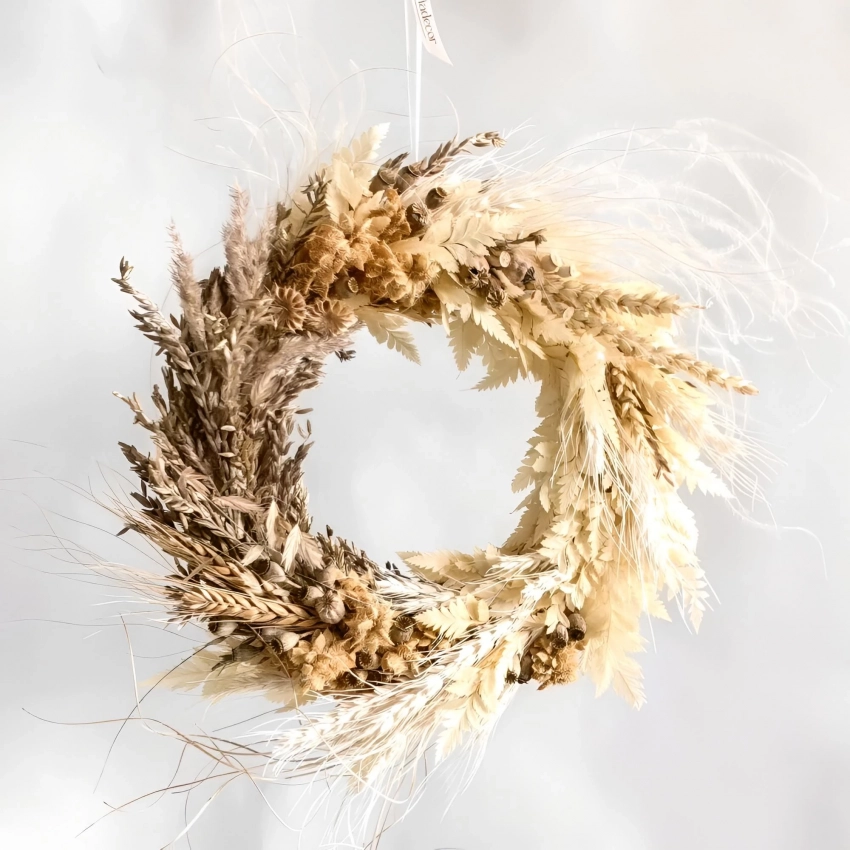 Для сезона-2025 особенно актуальны оттенки терракоты, песка, пыльно-розового и золота. Присмотритесь к пампасной траве, коробочкам лотоса или веткам эвкалипта — эти элементы уже стали классикой флористического декора.